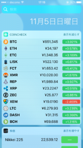 仮想通貨を購入するならコインチェックがオススメです。一番日本で有名なのとチャートがとても見やすいです。こちらは私のスマホの画面ですが、TOP画面に値動きを表示させています。